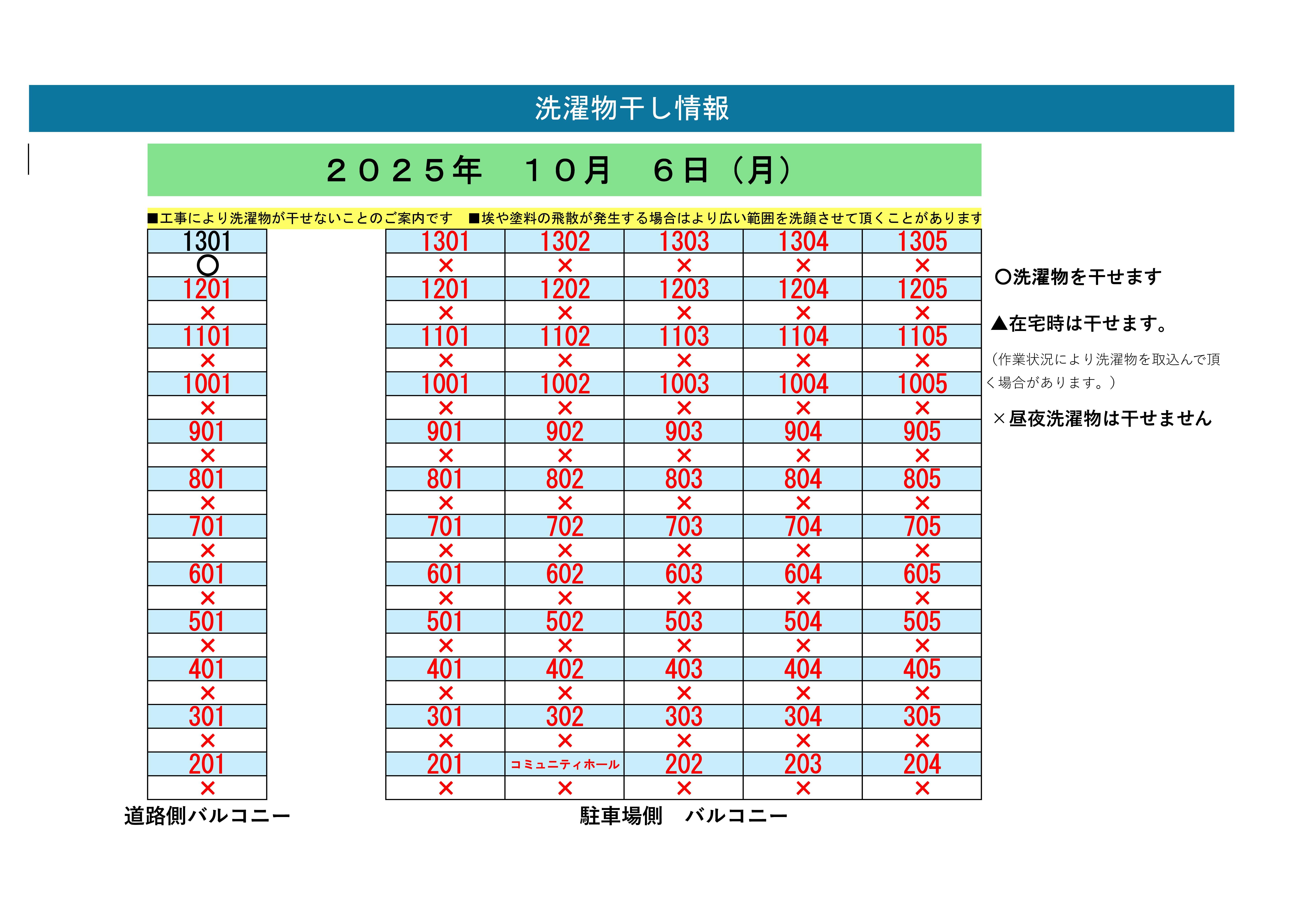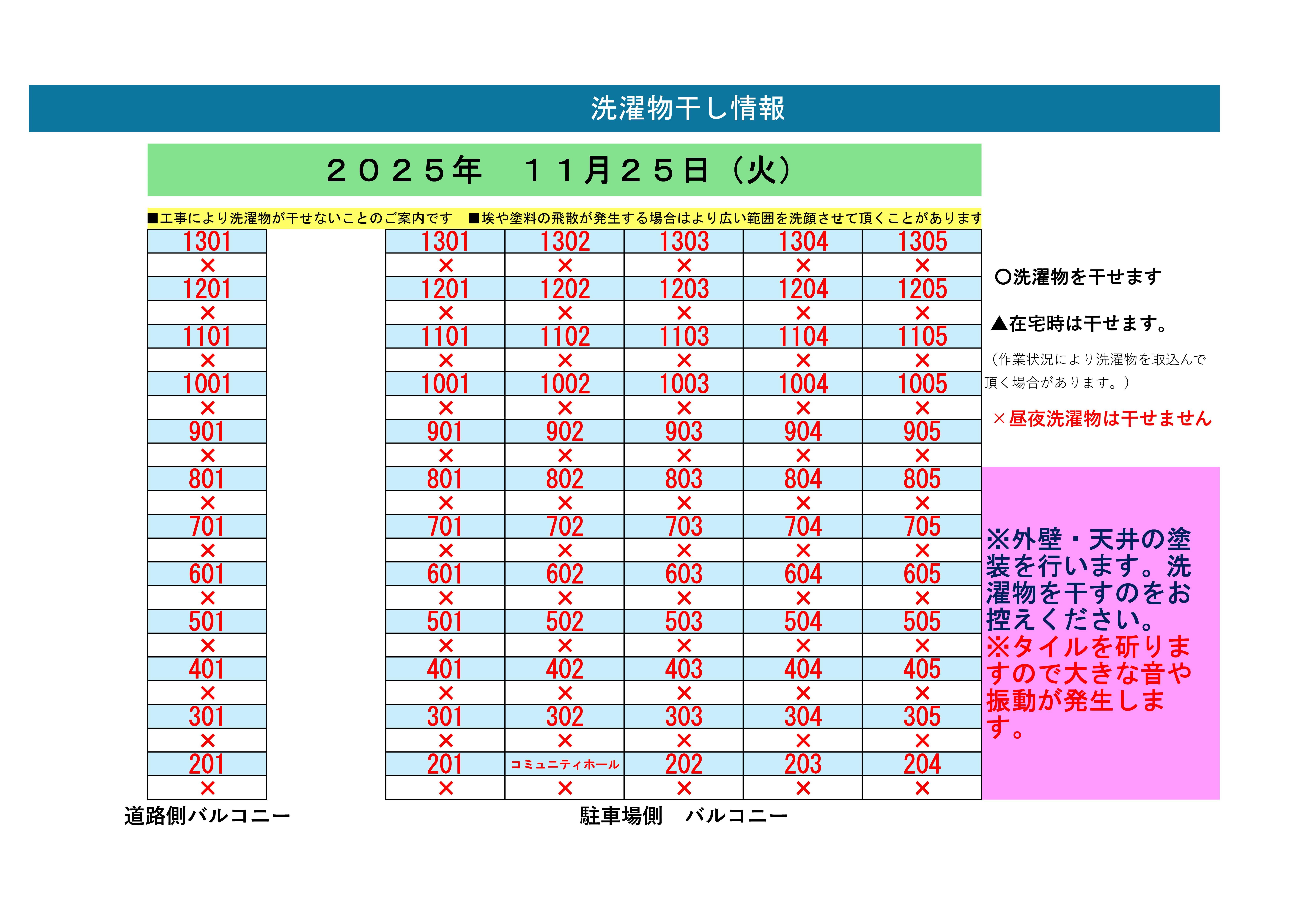 作業の状況によってはベランダに洗濯物を干していただけない場合がございます。また、工事中は仮設足場は危険ですので昇らないようにお願いいたします。